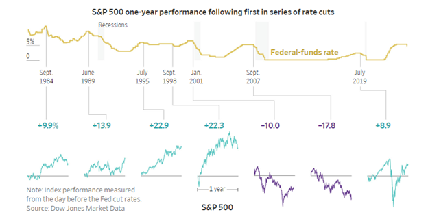 The Wall Street Journal charted stock price movement after the last seven Federal Reserve Bank (FRB) interest rate cuts. Solid returns for stock prices if rate cuts start during periods of economic expansion. The chart indicates solid returns except 2007, the great recession, and 2001, during the dot com sell off.