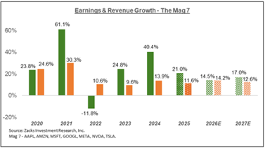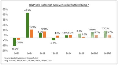 Looking at growth estimates between the Mag 7 and the remainder of the S&P 500, we are collecting more evidence of the “broadening out” of returns that we have extensively written about this year. As pictured in the graphs below, earnings projections from Zacks depict a narrowing of the spread between Mag 7 earnings growth and earnings growth of the remainder. In 2024, the difference was 35.8%, which is projected to fall to 12.9% in 2025 and then 3.6% the following year.