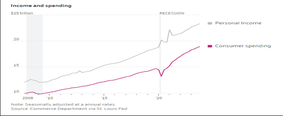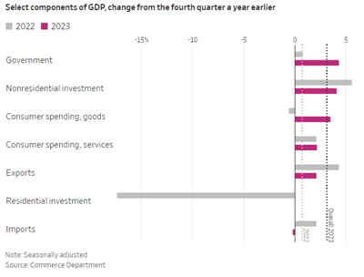 According to the Commerce Department, the economy grew 3.3% during the fourth quarter of 2023, with consumer spending, driven by payroll increases, contributing 1.9%.  The full year 2023 GDP locked in at 3.1%, a robust growth level considering that many economists were forecasting recession.  As forecasted by Treasury Secretary Yellen and the Federal Reserve Board, wages, employment, and spending have contributed to this soft landing.  Higher wages will continue to encourage spending into 2024, raising the prospects for sustained economic growth and strong performance by profitable stocks.