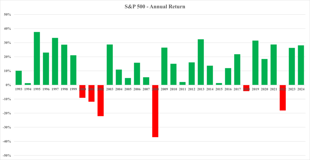 Investment results for the past two years have been quite rewarding to investors, with the S&P 500 yielding double digit returns for two years in a row. Sustained growth at this level for consecutive years rivals returns last seen in the 1990’s, prompting many to ask: Will stocks continue to provide strong returns in 2025?
