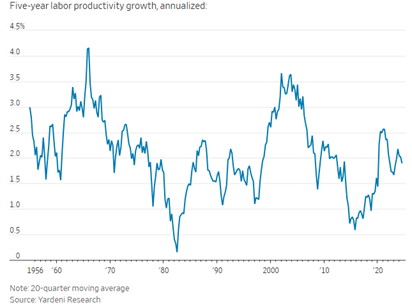 The Wall Street Journal wrote last week that the U.S. could be on the cusp of a productivity boom reminiscent of the second half of the 1990’s which was triggered by technology. The Congressional Budget Office (CBO) sees federal debt held by the public rising from 99% of gross domestic product in 2024 to 116% in 2034. This assumes total factor productivity growth of just 1.1% per year. Raising this estimated productivity growth by just half of a percentage point would mean the debt-to-GDP ratio reaches a much more manageable level of 108% by 2034. Ed Yardeni’s forecast on productivity growth would indicate an overall bullish outlook for the stock market in 2025. He forecasts a boost in productivity that could reach 3.5% in the second half of this decade, a boom in profitability for constituents of the S&P 500.
