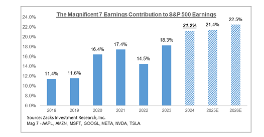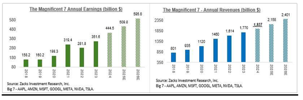 Zacks chart demonstrating Magnificent 7 growth of Earnings and Revenues since 2018 details growth well in excess of S&P500 average explaining why the price performance of the group is so much greater than market averages.