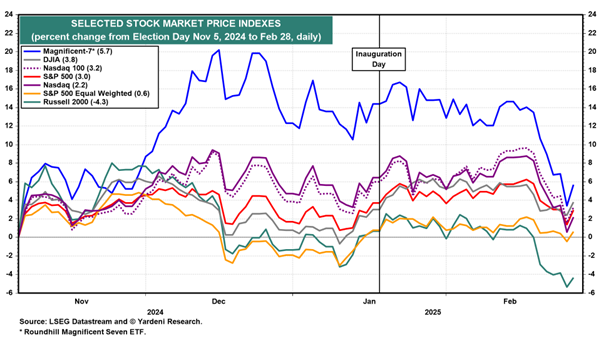 Changes emanating from Washington have rattled investor confidence erasing gain and most indexes since November election. As the chart below indicates most investment style, including the Magnificent Seven are trading near their lows achieved in November. We don’t believe that wiping out stock market gains is a goal of the current administration or any administration, we expect some mitigation of government employee reduction.